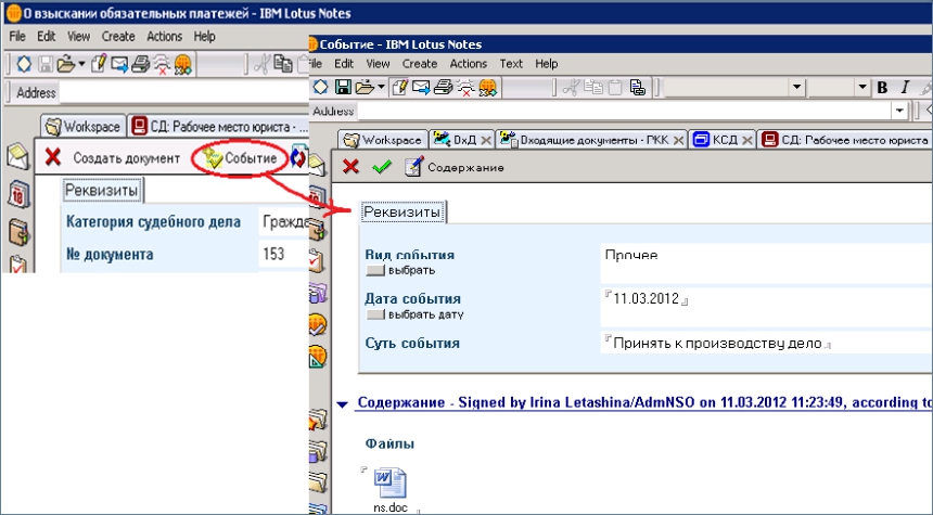 По мере того, как в ходе работы по судебному делу происходят различные события (назначение судебного слушания, подача апелляций, вынесение решений или другие судебные действия), специалисты юридической службы ИОГВ, участвующих в деле, создают специальные документы-события, отражающие суть события и позволяющие указать ссылку на соответствующий документ судебного дела.
